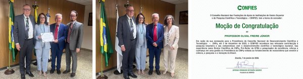 No dia 13 de janeiro de 2026, na sede do Conselho Nacional de Desenvolvimento Científico e Tecnológico (CNPq), em Brasília – DF, o CONFIES – Conselho Nacional das Fundações de Apoio às Instituições de Ensino Superior e de Pesquisa Científica e Tecnológica realizou a entrega da Moção de Congratulação ao Professor Olival Freire Júnior, em reconhecimento à sua nomeação para a Presidência do CNPq.